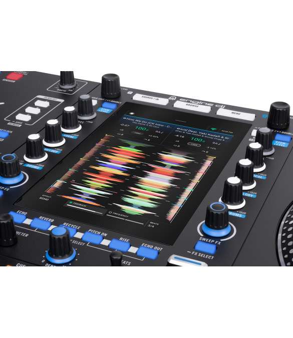 Le System One ne se contente pas d’être puissant : il restitue aussi des sensations de jeu dignes d’une véritable platine professionnelle. Ses deux plateaux motorisés en aluminium de 7,2 pouces à couple élevé offrent un contrôle ultra précis, complété par les faders Precision Feel à tension ajustable et le célèbre crossfader Mag Four, calibrable directement depuis l’écran tactile pour une réactivité optimale en scratch. Cet écran HD 7 pouces apporte une visibilité parfaite des formes d’onde RGB et un accès fluide aux informations essentielles du mix.